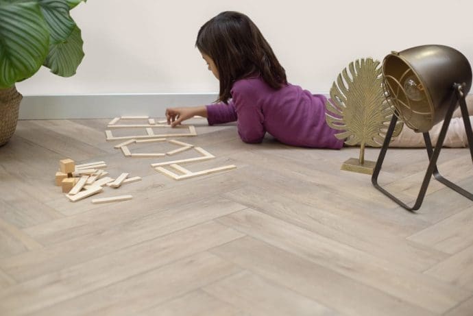 Deze vloer heeft een warme, luxe uitstraling die lijkt op eikenhout met een subtiele gerookte tint. Het visgraatpatroon en de voelbare houtstructuur maken de vloer nauwelijks te onderscheiden van echt parket. De V-groef rondom elke plank benadrukt de visgraatvorm, wat zorgt voor een verfijnde uitstraling. De lichte, rokerige kleur past perfect in moderne en klassieke interieurs. De Floer Visgraat Click PVC Gerookt vloer is krasbestendig dankzij de robuuste slijtlaag van 0,55 mm. Hij is 100% waterbestendig, waardoor hij geschikt is voor keukens, badkamers en andere vochtige ruimtes. De vloer is bovendien geschikt voor vloerverwarming door de lage warmteweerstand van 0,039 m²K/W. Ook voor commerciële ruimtes biedt de vloer de juiste stevigheid en duurzaamheid.