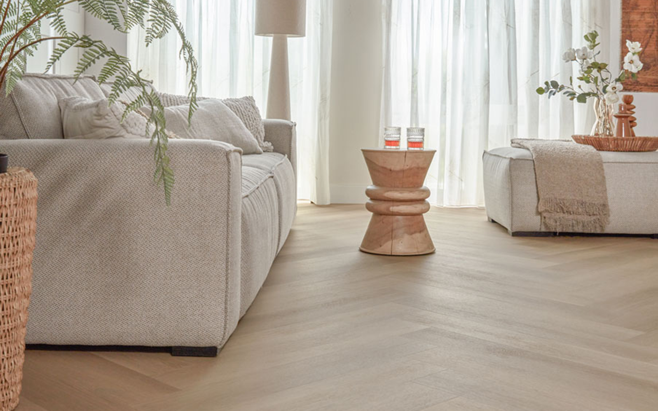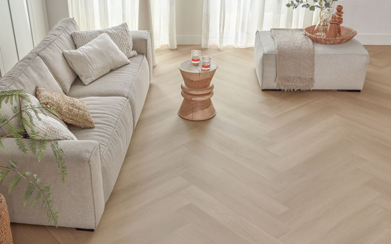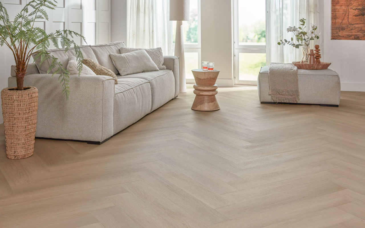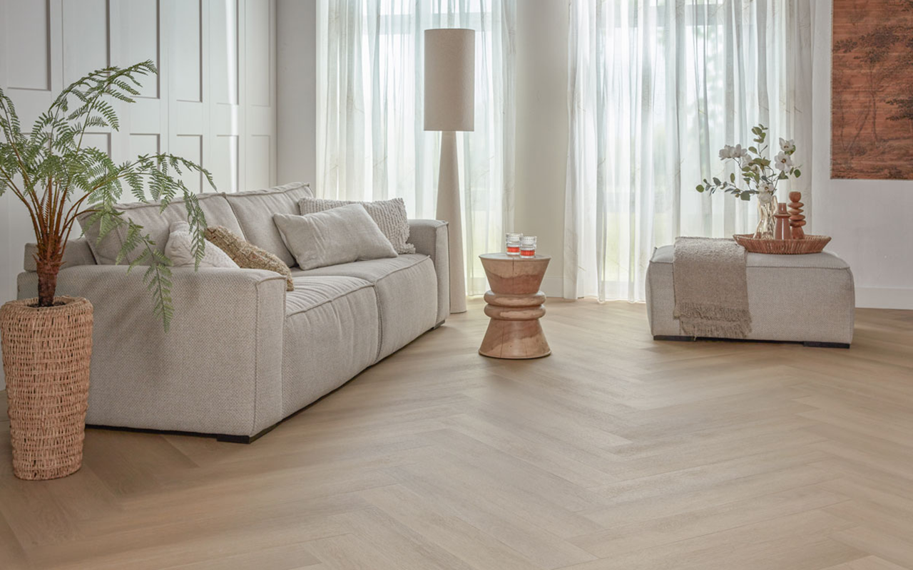 Met zijn extra grote visgraatpatroon brengt deze vloer direct karakter in de ruimte. De zachte zandkleur, geïnspireerd op licht eikenhout, zorgt voor een rustige en elegante basis die zich makkelijk laat combineren met diverse interieurkleuren. De matte afwerking geeft het geheel een ingetogen luxe uitstraling, zonder te overheersen. Of je nu kiest voor een minimalistisch interieur of juist een warm en klassiek geheel, deze visgraat vloer voegt altijd een gevoel van balans en verfijning toe.