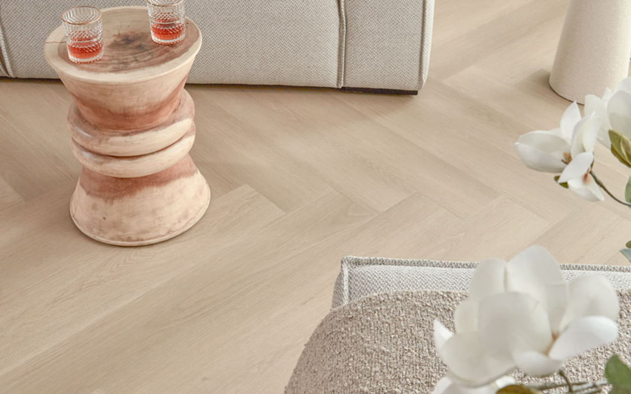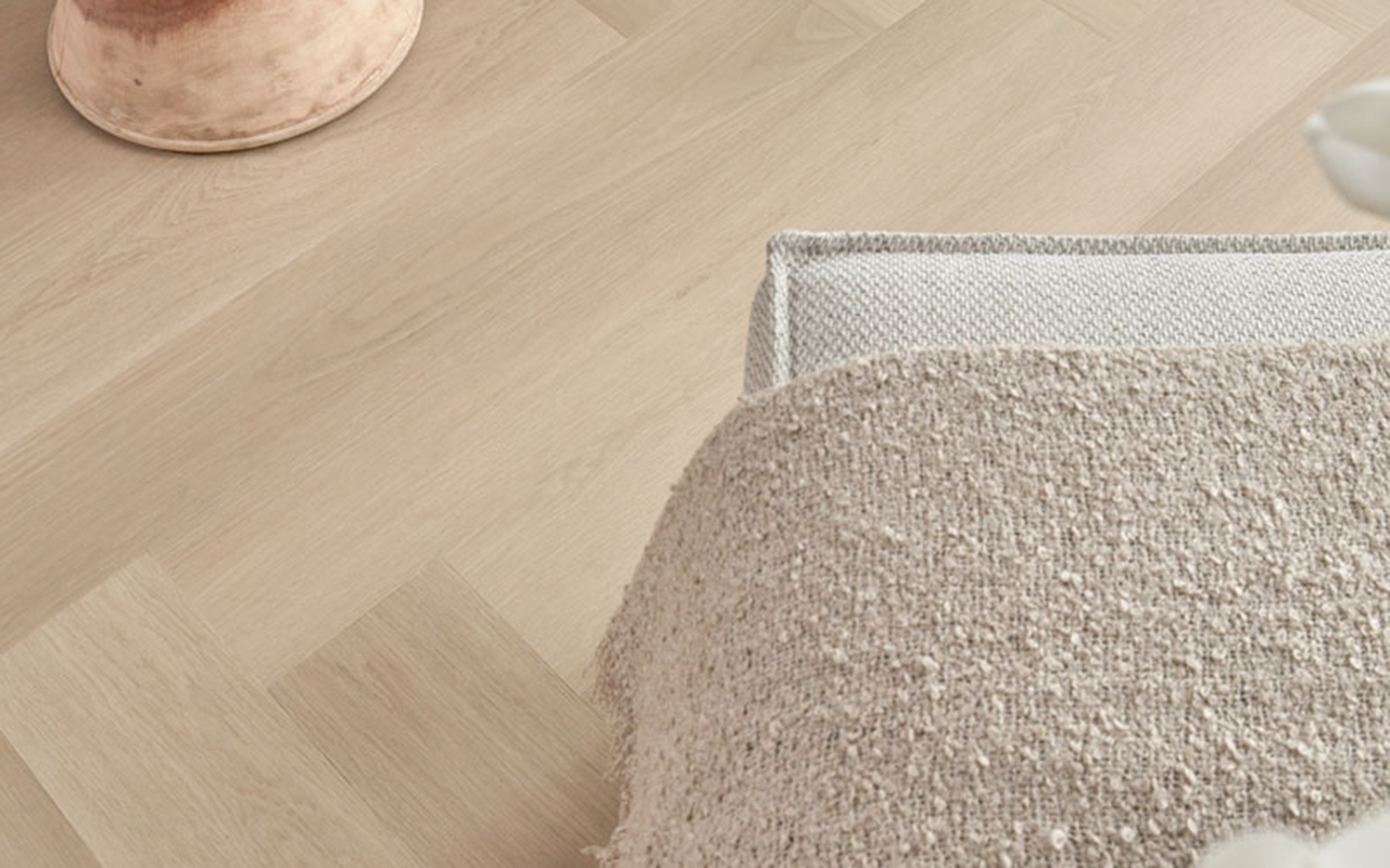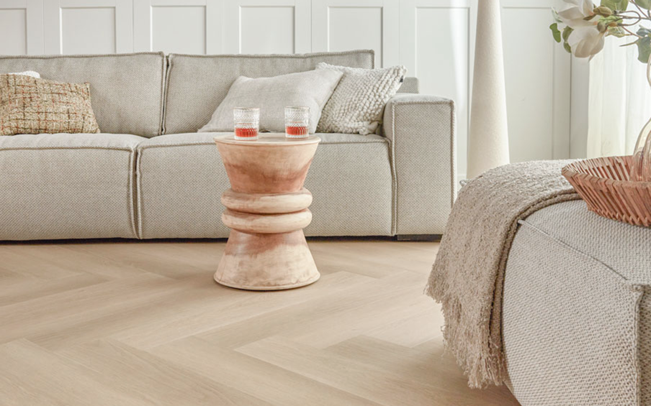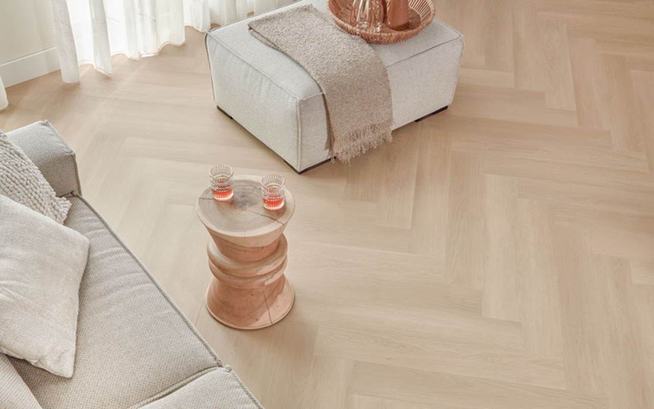 Met zijn extra grote visgraatpatroon brengt deze vloer direct karakter in de ruimte. De zachte zandkleur, geïnspireerd op licht eikenhout, zorgt voor een rustige en elegante basis die zich makkelijk laat combineren met diverse interieurkleuren. De matte afwerking geeft het geheel een ingetogen luxe uitstraling, zonder te overheersen. Of je nu kiest voor een minimalistisch interieur of juist een warm en klassiek geheel, deze visgraat vloer voegt altijd een gevoel van balans en verfijning toe.